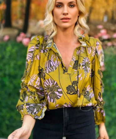 Yellow Vintage Floral V Neck Ruffle Trim Long Sleeve Blouse
